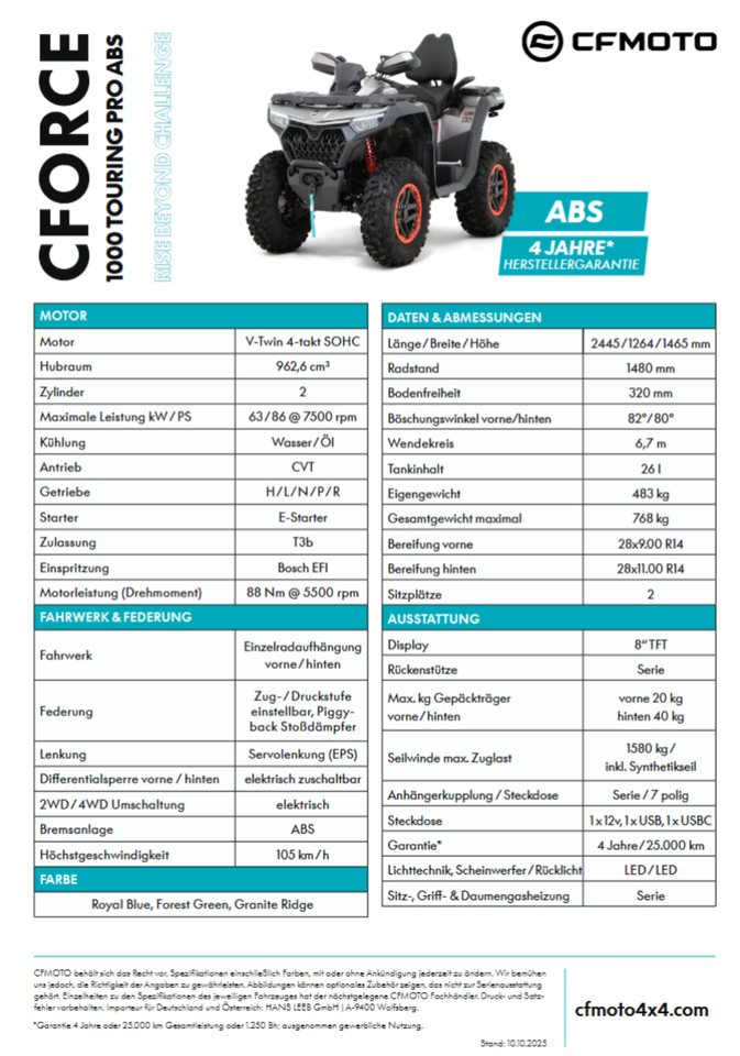 Die neue CFORCE 1000 TOURING PRO ist das leistungsstrkste ATV in der CFMOTO Fahrzeugpalette - und prsentiert mit beeindruckenden Leistungsdaten, innovativer Technologie und ihrer herausragenden Ausstattung eine neue Dimension von Offroad-Fahrspa.