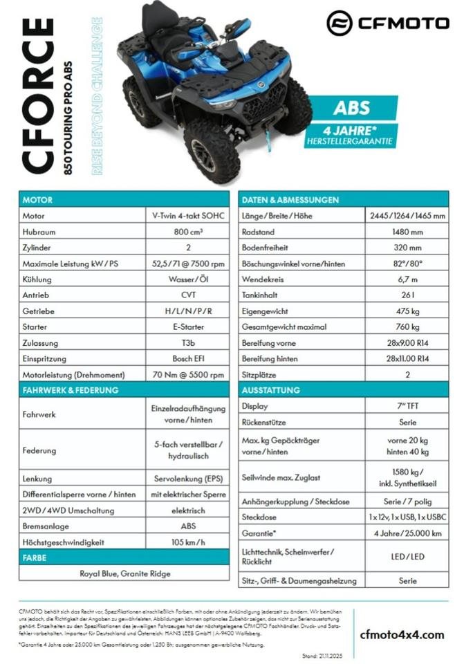 Die neue CFORCE 850 TOURING PRO ABS ist bereit fr jedes Abenteuer ob im harten Arbeitseinsatz, beim Offroad-Trip oder als kraftvoller Freizeitbegleiter. Ihr robuster V2-Motor, die durchdachte Ergonomie und die hochwertige Ausstattung machen sie zu einem echten Allrounder. Fr noch mehr Funktionalitt lsst sich das Fahrzeug mit optionalem Zubehr wie einem Topcase sowie Front- und Heckbumpern individuell erweitern.